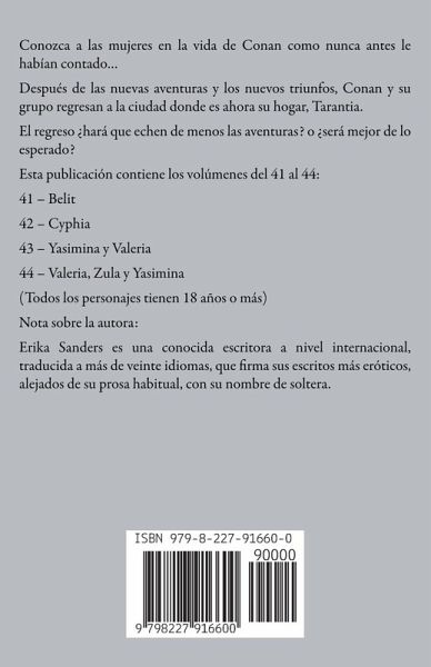 Conozca a las mujeres en la vida de Conan como nunca antes le habían contado... Después de las nuevas aventuras y los nuevos triunfos, Conan y su grupo regresan a la ciudad donde es ahora su hogar, Tarantia. El regreso ¿hará que echen de menos las aventuras? o ¿será mejor de lo esperado? Esta publicación contiene los volúmenes del 41 al 44: 41 - Belit 42 - Cyphia 43 - Yasimina y Valeria 44 - Valeria, Zula y Yasimina (Todos los personajes tienen 18 años o más) Nota sobre la autora: Erika Sanders es una conocida escritora a nivel internacional, traducida a más de veinte idiomas, que firma sus escritos más eróticos, alejados de su prosa habitual, con su nombre de soltera.