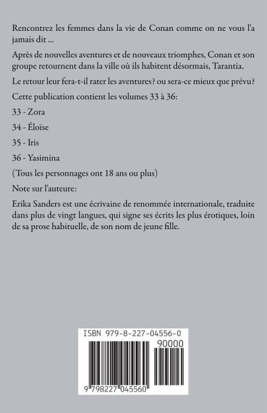 Rencontrez les femmes dans la vie de Conan comme on ne vous l'a jamais dit ... Après de nouvelles aventures et de nouveaux triomphes, Conan et son groupe retournent dans la ville où ils habitent désormais, Tarantia. Le retour leur fera-t-il rater les aventures? ou sera-ce mieux que prévu? Cette publication contient les volumes 33 à 36: 33 - Zora 34 - Éloïse 35 - Iris 36 - Yasimina (Tous les personnages ont 18 ans ou plus) Note sur l'auteure: Erika Sanders est une écrivaine de renommée internationale, traduite dans plus de vingt langues, qui signe ses écrits les plus érotiques, loin de sa prose habituelle, de son nom de jeune fille.