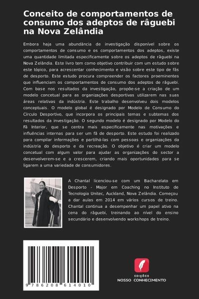 Embora haja uma abundância de investigação disponível sobre os comportamentos de consumo e os comportamentos dos adeptos, existe uma quantidade limitada especificamente sobre os adeptos de râguebi na Nova Zelândia. Este livro tem como objetivo contribuir com um estudo sobre este tópico, para acrescentar conhecimento e visão sobre este tipo de fãs de desporto. Este estudo procura compreender os factores proeminentes que influenciam os comportamentos de consumo dos adeptos de râguebi. Com base nos resultados da investigação, propõe-se a criação de um modelo concetual para as organizações desportivas utilizarem nas suas áreas relativas da indústria. Este trabalho desenvolveu dois modelos conceptuais. O modelo global é designado por Modelo de Consumo do Círculo Desportivo, que incorpora os principais temas e subtemas dos resultados da investigação. O segundo modelo é designado por Modelo do Fã Interior, que se centra mais especificamente nas motivações e influências internas para ser um fã de desporto. Este estudo foi realizado para compilar informações e partilhá-las com pessoas e organizações da indústria do desporto e da recreação. O objetivo é criar um modelo concetual com algum valor para ajudar as organizações do sector a desenvolverem-se e a crescerem, criando mais oportunidades para se ligarem a uma variedade de consumidores.