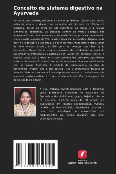Na sociedade humana, enfrentamos muitos problemas relacionados com o estilo de vida e o stress, que aumentam de dia para dia. Nesta era moderna, devido ao estilo de vida sedentário, ao stress e a hábitos alimentares deficientes, as pessoas sofrem de muitas doenças dos Annavaha Srotas. Anatomicamente, Annavaha Srotas pode ser considerado como a parte superior do TGI, desde a boca até ao intestino delgado, onde ocorre a digestão e a absorção. Se conhecermos muito bem o Moola Sthan de determinados Srotas, é fácil gerir as doenças que lhes estão associadas. Desta forma, seremos capazes de estabelecer o papel do Srotomool no tratamento ou patologia dos Srotas em particular. Assim, o objetivo deste livro é explorar a base científica dos princípios ayurvédicos entre os Srotas e o Srotomool no que diz respeito às doenças relacionadas com os Srotas Annavaha. A utilidade do conhecimento do local de Srotomoola (origem) dos Srotas (canais) não é diretamente descrita no Samhita. Este estudo ajudará a compreender melhor o conhecimento da anatomia gastrointestinal e o seu aspeto aplicado. Por conseguinte, há necessidade de o fazer.