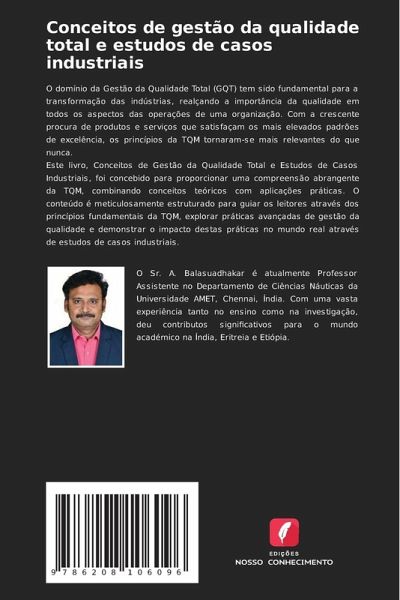O domínio da Gestão da Qualidade Total (GQT) tem sido fundamental para a transformação das indústrias, realçando a importância da qualidade em todos os aspectos das operações de uma organização. Com a crescente procura de produtos e serviços que satisfaçam os mais elevados padrões de excelência, os princípios da TQM tornaram-se mais relevantes do que nunca.Este livro, Conceitos de Gestão da Qualidade Total e Estudos de Casos Industriais, foi concebido para proporcionar uma compreensão abrangente da TQM, combinando conceitos teóricos com aplicações práticas. O conteúdo é meticulosamente estruturado para guiar os leitores através dos princípios fundamentais da TQM, explorar práticas avançadas de gestão da qualidade e demonstrar o impacto destas práticas no mundo real através de estudos de casos industriais.