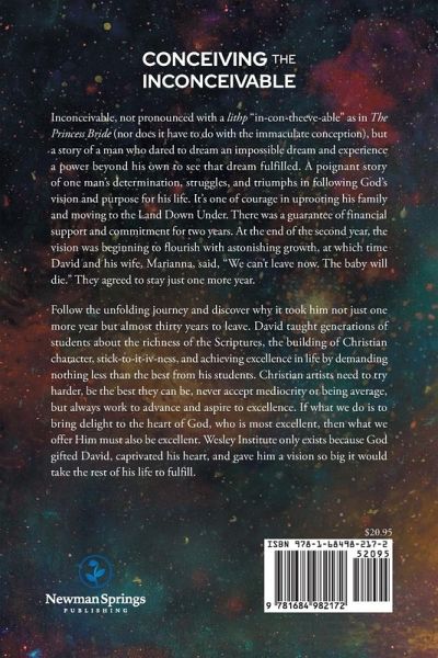 Inconceivable, not pronounced with a lithp "in-con-theeve-able" as in The Princess Bride (nor does it have to do with the immaculate conception), but a story of a man who dared to dream an impossible dream and experience a power beyond his own to see that dream fulfilled. A poignant story of one man's determination, struggles, and triumphs in following God's vision and purpose for his life. It's one of courage in uprooting his family and moving to the Land Down Under. There was a guarantee of financial support and commitment for two years. At the end of the second year, the vision was beginning to flourish with astonishing growth, at which time David and his wife, Marianna, said, "We can't leave now. The baby will die." They agreed to stay just one more year. Follow the unfolding journey and discover why it took him not just one more year but almost thirty years to leave. David taught generations of students about the richness of the Scriptures, the building of Christian character, stick-to-it-iv-ness, and achieving excellence in life by demanding nothing less than the best from his students. Christian artists need to try harder, be the best they can be, never accept mediocrity or being average, but always work to advance and aspire to excellence. If what we do is to bring delight to the heart of God, who is most excellent, then what we offer Him must also be excellent. Wesley Institute only exists because God gifted David, captivated his heart, and gave him a vision so big it would take the rest of his life to fulfill.
