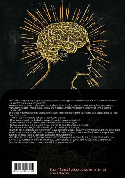 Você está pronto para transformar sua capacidade de concentração e produtividade? 'Concentração Total' oferece um guia abrangente e prático para aprimorar seu foco mental e otimizar seu desempenho diário.Este livro apresenta técnicas fundamentadas para desenvolver uma mente mais focada e produtiva, abordando cinco áreas essenciais:1. Fundamentos Mentais da Concentração- Práticas de consciência e atenção plena- Técnicas para minimizar distrações- Exercícios de respiração e relaxamento2. Aspectos Físicos- Importância do movimento e exercício físico- Nutrição para melhor desempenho mental- Estratégias de recuperação e sono3. Organização do Ambiente de Trabalho- Sistemas eficientes de organização- Ergonomia e iluminação adequada- Gestão de ruídos e clima4. Treinamento Diário da Concentração- Exercícios práticos de atenção- Desenvolvimento de rotinas eficientes- Técnicas de gestão do estresse5. Trabalho Concentrado- Métodos de organização de tarefas- Técnicas de automotivação- Estratégias para manter o focoCada capítulo inclui exercícios práticos, gráficos ilustrativos e ferramentas aplicáveis que você pode implementar imediatamente. O livro fornece um caminho claro para desenvolver hábitos que melhoram sua concentração e produtividade.Descubra como otimizar seu ambiente de trabalho, gerenciar seu tempo com eficiência e manter o foco mesmo em situações desafiadoras. Aprenda a criar rotinas que apoiam seu desempenho mental e a desenvolver uma prática sustentável de concentração.Este livro foi criado com o uso de tecnologias inovadoras, como Inteligência Artificial e ferramentas especialmente desenvolvidas - por exemplo, na geração de ideias, pesquisa, escrita, edição, garantia de qualidade e design de ilustrações decorativas.Desta forma, queremos oferecer-lhe uma experiência de leitura particularmente coerente, moderna e de ainda maior qualidade.