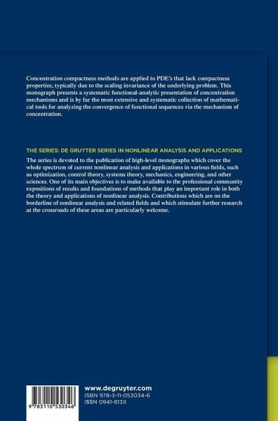 Concentration compactness methods are applied to PDE's that lack compactness properties, typically due to the scaling invariance of the underlying problem. This monograph presents a systematic functional-analytic presentation of concentration mechanisms and is by far the most extensive and systematic collection of mathematical tools for analyzing the convergence of functional sequences via the mechanism of concentration.