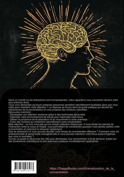 Dans un monde où les distractions sont omniprésentes, la capacité à se concentrer est devenue un véritable défi. Ce livre sur la concentration propose une approche complète et pratique pour développer et maintenir votre focus au quotidien.Structuré en cinq parties principales, cet ouvrage aborde :1. Les fondements mentaux de la concentration, explorant la pleine conscience et les techniques de focalisation pour cultiver un esprit plus serein et attentif.2. L'aspect physique de la concentration, détaillant l'importance du mouvement, de la nutrition et du repos dans notre capacité à mieux se concentrer.3. L'optimisation de l'environnement de travail, avec des conseils pratiques sur l'organisation spatiale, la gestion du temps et les facteurs environnementaux.4. Les exercices quotidiens pour apprendre à se concentrer, incluant des routines matinales et du soir, ainsi que des techniques de gestion du stress.5. Les méthodes de travail concentré, présentant des stratégies d'organisation et d'optimisation de la performance.Chaque chapitre propose des exercices pratiques, des techniques éprouvées et des conseils applicables immédiatement. Les lecteurs découvriront comment :- Développer leur conscience et leur attention- Optimiser leur environnement pour favoriser la concentration- Intégrer des habitudes bénéfiques dans leur routine quotidienne- Gérer efficacement leur énergie mentale et physiqueCe guide pratique s'adresse à toute personne souhaitant améliorer sa capacité de concentration, que ce soit dans un contexte professionnel ou personnel.Ce livre a été créé en utilisant des technologies innovantes telles que l'Intelligence Artificielle ainsi que des outils spécialement développés - par exemple, pour la recherche d'idées, la recherche d'informations, l'écriture, la relecture, l'assurance qualité et la conception d'illustrations décoratives.Ainsi, nous souhaitons vous offrir une expérience de lecture particulièrement cohérente, moderne et d'une qualité encoresupérieure.