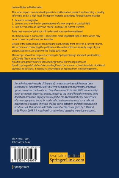 Since the impressive works of Talagrand, concentration inequalities have been recognized as fundamental tools in several domains such as geometry of Banach spaces or random combinatorics. They also turn out to be essential tools to develop a non-asymptotic theory in statistics, exactly as the central limit theorem and large deviations are known to play a central part in the asymptotic theory. An overview of a non-asymptotic theory for model selection is given here and some selected applications to variable selection, change points detection and statistical learning are discussed. This volume reflects the content of the course given by P. Massart in St. Flour in 2003. It is mostly self-contained and accessible to graduate students.