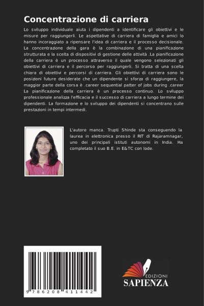 Lo sviluppo individuale aiuta i dipendenti a identificare gli obiettivi e le misure per raggiungerli. Le aspettative di carriera di famiglia e amici lo hanno incoraggiato a ripensare l'idea di carriera e il processo decisionale. La concentrazione della gara è la combinazione di una pianificazione strutturata e la scelta di dispositivi di gestione delle attività .La pianificazione della carriera è un processo attraverso il quale vengono selezionati gli obiettivi di carriera e il percorso per raggiungerli. Si tratta di una scelta chiara di obiettivi e percorsi di carriera. Gli obiettivi di carriera sono le posizioni future desiderate che un dipendente si sforza di raggiungere, la maggior parte della corsa è .career sequential patter of jobs during .career La pianificazione della carriera è un processo continuo. Lo sviluppo professionale analizza l'efficacia e il successo di carriera a lungo termine dei dipendenti. La formazione e lo sviluppo dei dipendenti si concentrano sulle prestazioni in tempi intermedi.