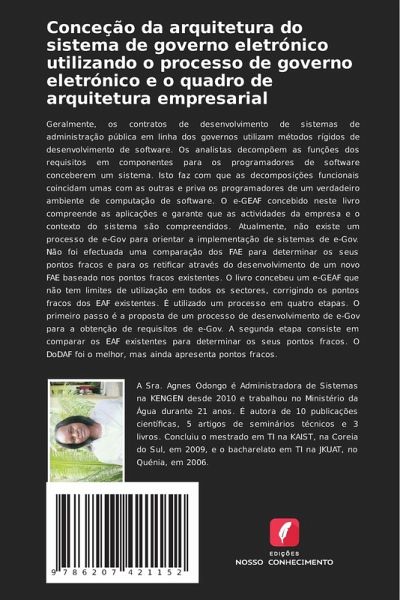 Geralmente, os contratos de desenvolvimento de sistemas de administração pública em linha dos governos utilizam métodos rígidos de desenvolvimento de software. Os analistas decompõem as funções dos requisitos em componentes para os programadores de software conceberem um sistema. Isto faz com que as decomposições funcionais coincidam umas com as outras e priva os programadores de um verdadeiro ambiente de computação de software. O e-GEAF concebido neste livro compreende as aplicações e garante que as actividades da empresa e o contexto do sistema são compreendidos. Atualmente, não existe um processo de e-Gov para orientar a implementação de sistemas de e-Gov. Não foi efectuada uma comparação dos FAE para determinar os seus pontos fracos e para os retificar através do desenvolvimento de um novo FAE baseado nos pontos fracos existentes. O livro concebeu um e-GEAF que não tem limites de utilização em todos os sectores, corrigindo os pontos fracos dos EAF existentes. É utilizado um processo em quatro etapas. O primeiro passo é a proposta de um processo de desenvolvimento de e-Gov para a obtenção de requisitos de e-Gov. A segunda etapa consiste em comparar os EAF existentes para determinar os seus pontos fracos. O DoDAF foi o melhor, mas ainda apresenta pontos fracos.