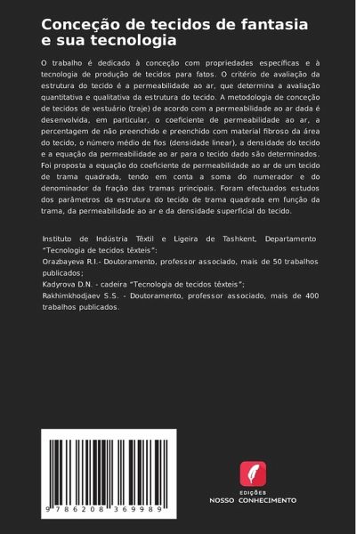 O trabalho é dedicado à conceção com propriedades específicas e à tecnologia de produção de tecidos para fatos. O critério de avaliação da estrutura do tecido é a permeabilidade ao ar, que determina a avaliação quantitativa e qualitativa da estrutura do tecido. A metodologia de conceção de tecidos de vestuário (traje) de acordo com a permeabilidade ao ar dada é desenvolvida, em particular, o coeficiente de permeabilidade ao ar, a percentagem de não preenchido e preenchido com material fibroso da área do tecido, o número médio de fios (densidade linear), a densidade do tecido e a equação da permeabilidade ao ar para o tecido dado são determinados. Foi proposta a equação do coeficiente de permeabilidade ao ar de um tecido de trama quadrada, tendo em conta a soma do numerador e do denominador da fração das tramas principais. Foram efectuados estudos dos parâmetros da estrutura do tecido de trama quadrada em função da trama, da permeabilidade ao ar e da densidade superficial do tecido.