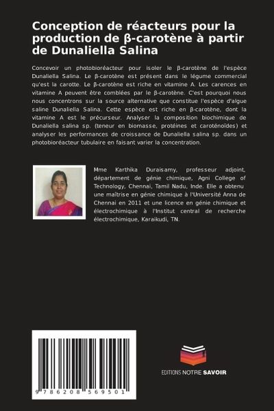 Concevoir un photobioréacteur pour isoler le beta-carotène de l'espèce Dunaliella Salina. Le beta-carotène est présent dans le légume commercial qu'est la carotte. Le beta-carotène est riche en vitamine A. Les carences en vitamine A peuvent être comblées par le beta-carotène. C'est pourquoi nous nous concentrons sur la source alternative que constitue l'espèce d'algue saline Dunaliella Salina. Cette espèce est riche en beta-carotène, dont la vitamine A est le précurseur. Analyser la composition biochimique de Dunaliella salina sp. (teneur en biomasse, protéines et caroténoïdes) et analyser les performances de croissance de Dunaliella salina sp. dans un photobioréacteur tubulaire en faisant varier la concentration.