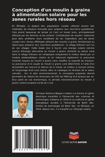 En Éthiopie, la plupart des populations rurales utilisent encore des méthodes de mouture manuelle pour préparer leur nourriture quotidienne. Cela prend beaucoup de temps et c'est un travail ardu, principalement effectué par les femmes et les enfants. L'introduction de moulins motorisés peut donc améliorer leurs conditions de vie. Cependant, peu de zones rurales hors réseau d'Éthiopie utilisent des moulins à grains fonctionnant au diesel pour préparer leur nourriture quotidienne ; le village d'Amasri est l'un de ces villages. Cette étude vise à fournir une énergie solaire comme source d'énergie alternative au moulin à grains alimenté au diesel situé dans le village d'Amasri en remplaçant uniquement le moteur diesel par un module photovoltaïque solaire et en réduisant également la puissance d'entrée requise du moulin à grains sans modifier la capacité de mouture. La puissance et le couple du moulin à grains sont déterminés à l'aide d'un tachymètre qui mesure la vitesse de la meule. Le moteur à courant continu et l'engrenage droit sont choisis dans le catalogue en fonction de la valeur calculée... Sur le plan environnemental, la conception proposée devrait permettre de réduire les émissions de CO2 de 5400 kg (5,4 tonnes) par an. D'un point de vue économique, la période d'amortissement du moulin à grains solaire proposé serait de 2 ans.
