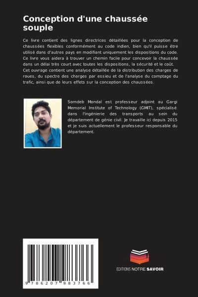 Ce livre contient des lignes directrices détaillées pour la conception de chaussées flexibles conformément au code indien, bien qu'il puisse être utilisé dans d'autres pays en modifiant uniquement les dispositions du code. Ce livre vous aidera à trouver un chemin facile pour concevoir la chaussée dans un délai très court avec toutes les dispositions, la sécurité et le coût.Cet ouvrage contient une analyse détaillée de la distribution des charges de roues, du spectre des charges par essieu et de l'analyse du comptage du trafic, ainsi que de leurs effets sur la conception des chaussées.