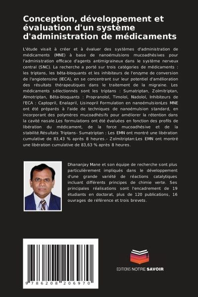 L'étude visait à créer et à évaluer des systèmes d'administration de médicaments (MNE) à base de nanoémulsions mucoadhésives pour l'administration efficace d'agents antimigraineux dans le système nerveux central (SNC). La recherche a porté sur trois catégories de médicaments : les triptans, les bêta-bloquants et les inhibiteurs de l'enzyme de conversion de l'angiotensine (IECA), en se concentrant sur leur potentiel d'amélioration des résultats thérapeutiques dans le traitement de la migraine. Les médicaments sélectionnés sont les triptans : Sumatriptan, Zolmitriptan, Almotriptan, Bêta-bloquants : Propranolol, Timolol, Nadolol, Inhibiteurs de l'ECA : Captopril, Enalapril, Lisinopril Formulation en nanoémulsionLes MNE ont été préparés à l'aide de techniques de nanoémulsion standard, en incorporant des polymères mucoadhésifs pour améliorer la rétention dans la cavité nasale.Les formulations ont été évaluées en fonction des profils de libération du médicament, de la force mucoadhésive et de la stabilité.Résultats Triptans- Sumatriptan : Les EMN ont montré une libération cumulative de 83,43 % après 8 heures.- Zolmitriptan:Les EMN ont montré une libération cumulative de 83,63 % après 8 heures.