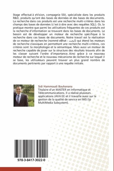 Stage effectué à eVision, compagnie SSII, spécialisée dans les produits R&D, produits qu'ont des bases de données et des bases de documents. La recherche dans ces produits est une recherche multi-critères dans les champs des bases de données (c'est à dire avec des requêtes SQL). Or, la pratique montre que parmi les utilisations fréquentes de ces produits est la recherche d'information se trouvant dans les bases de documents. Le besoin est de développer un moteur de recherche spécifique à la recherche dans ces bases de documents. Notre travail est la réalisation de ce moteur de recherche (nommé eBhat : ) qui étend les moteurs de recherche classiques en permettant une recherche multi-critères, ces critères sont :la morphologie et la sémantique. Mais aussi un moteur de recherche capable de jouer sur la structure des résultats trouvés afin de les classer suivant l'ordre d'importance. Ainsi grâce à ce nouveau moteur de recherche et le nouveau mécanisme de recherche sur lequel il se base, les utilisateurs peuvent trouver un plus grand nombre de documents pertinents par rapport à une requête initiale.