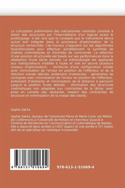 La conception préliminaire des mécanismes robotisés consiste à tester des structures par l''intermédiaire d''un logiciel avant le prototypage. Il est rare que la consigne que le mécanisme devra suivre soit intégrée dans le processus d''optimisation de la structure recherchée. Ces travaux s''appuient sur les algorithmes évolutionnaires pour effectuer parallèlement la synthèse de chaînes cinématiques et d''entrées de commande. La sélection d''une solution structurelle est basée sur ses performances dans la réalisation d''une tâche donnée. La méthodologie est appliquée aux manipulateurs mobiles à roues et met en uvre plusieurs niveaux d''optimisation: - recherche d''une configuration initiale avec minimisation de l''erreur en position de l''effecteur et de la direction initiale désirée, évitement d''obstacles; - génération de consignes avec minimisation de l''erreur en position de l''effecteur, évitement d''obstacles et minimisation de la distance à parcourir jusqu''à la position finale désirée; - élimination des structures cinématiques non adaptées aux contraintes de la tâche, avec prise en compte des obstacles, respect des contraintes de structure et minimisation de la masse des robots.