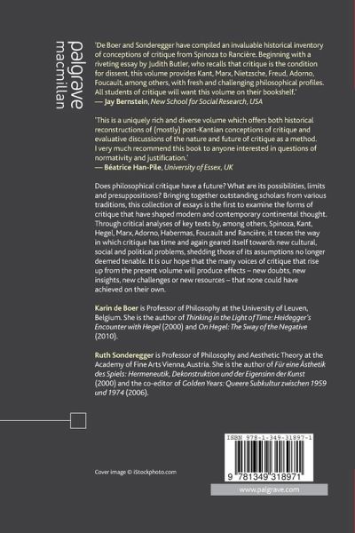 'De Boer and Sonderegger have compiled an invaluable historical inventory of conceptions of critique from Spinoza to Rancière. Beginning with a riveting essay by Judith Butler, who recalls that critique is the condition for dissent, this volume provides Kant, Marx, Nietzsche, Freud, Adorno, Foucault, among others, with fresh and challenging philosophical profiles. All students of critique will want this volume on their bookshelf.' - Jay Bernstein, New School for Social Research, New York, USA