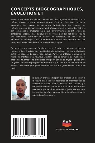 Avant la formation des plaques tectoniques, les organismes vivaient sur la même masse terrestre appelée centre d'origine. Plus tard, après la séparation des masses terrestres par la tectonique des plaques, les mêmes espèces d'organismes se sont séparées avec la masse terrestre et ont commencé à s'adapter au nouvel environnement et ont évolué en différentes espèces. Les oiseaux qui ne volent pas sur les bords voisins des continents, l'autruche en Afrique, les Tinamous, les Rheas et les Tnamous en Amérique latine, et l'émeu en Australie sont quelques-uns des indicateurs de la réalité de la tectonique des plaques.De nombreuses espèces d'antilopes sont réparties en Afrique et dans le monde entier. Il existe des similitudes physiologiques et morphologiques entre les espèces du genre Tragelaphus. Parmi les antilopes africaines, le nyala de montagne(Tragelaphus buxtoni) est endémique de l'Éthiopie. Il présente davantage de similitudes morphologiques et physiologiques avec le grand koudou(Tragelaphus strepsiceros) que l'on trouve en Afrique du Sud-Est. Son arbre phylogénétique se situe entre le grand koudou et le bush back.