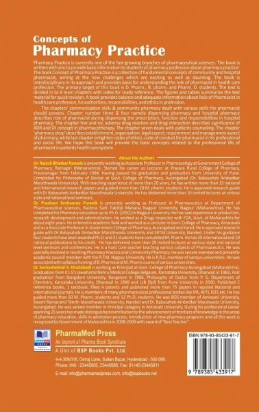 Pharmacy Practice is currently one of the fast-growing branches of pharmaceutical sciences. The book is written with aim to provide basic information to students of pharmacy profession about pharmacy practice. The book Concept of Pharmacy Practice is a collection of fundamental concepts of community and hospital pharmacist, aiming at the new challenges which are exciting as well as daunting. The book is interdisciplinary in its approach and provides basis for understanding the role of pharmacist in health care profession. The primary target of this book is D. Pharm., B. pharm. and Pharm. D. students. The text is divided in to 9 main chapters with index for ready reference. The figures and tables summarize the text material for quick revision. A book provides balance and adequate information about Role of Pharmacist in health care profession, his authorities, responsibilities, and ethics in profession. The chapters' communication skills & community pharmacy dealt with various skills the pharmacist should possess. Chapter number three & four namely dispensing pharmacy and hospital pharmacy describes role of pharmacist during dispensing the prescription, function and responsibilities in hospital pharmacy. The chapter five and six, adverse drug reaction and drug interaction describes significance of ADR and DI concept in pharmacotherapy, The chapter seven deals with patients counseling. The chapter 'pharmacy shop' describes establishment, organization, legal aspect, requirement and management aspect of pharmacy, while last chapter enlighten codes of ethics, code of conduct for pharmacist in his professional and social life. We hope this book will provide the basic concepts related to the professional life of pharmacist in patients health care system.