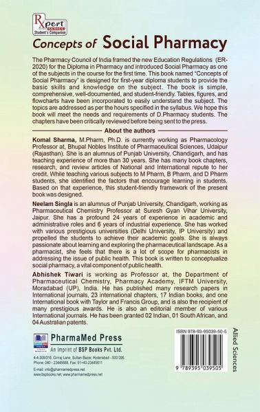 This book named "Concepts of Social Pharmacy" is designed for first-year diploma students to provide the basic skills and knowledge on the subject. The book is simple, comprehensive, well-documented, and student-friendly. Tables, figures, and flowcharts have been incorporated to easily understand the subject. The topics are addressed as per the hours specified in the syllabus. We hope this book will meet the needs and requirements of D.Pharmacy students. The chapters have been critically reviewed before being sent to the press.
