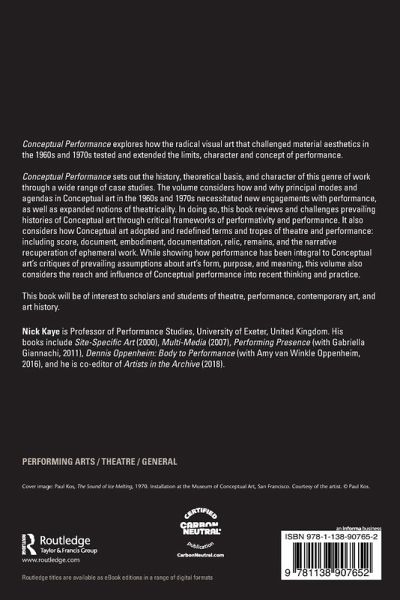 Conceptual Performance sets out the history, theoretical basis, and character of this genre of work through a wide range of case studies. The volume considers how and why principal modes and agendas in Conceptual art in the 1960s and 1970s necessitated new engagements with performance, as well as expanded notions of theatricality. In doing so, this book reviews and challenges prevailing histories of Conceptual art through critical frameworks of performativity and performance. It also considers how Conceptual art adopted and redefined terms and tropes of theatre and performance: including score, document, embodiment, documentation, relic, remains, and the narrative recuperation of ephemeral work. While showing how performance has been integral to Conceptual art's critiques of prevailing assumptions about art's form, purpose, and meaning, this volume also considers the reach and influence of Conceptual performance into recent thinking and practice.