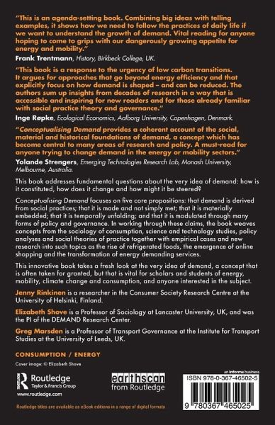 Conceptualising Demand focuses on five core propositions: that demand is derived from social practices; that it is made and not simply met; that it is materially embedded and temporally unfolding; and that it is modulated through many forms of policy and governance. In working through these claims, the book weaves concepts from the sociology of consumption, science and technology studies, policy analyses and social theories of practice together with empirical cases and new research into such topics as the rise of refrigerated foods, the emergence of online shopping and the transformation of energy demanding services.