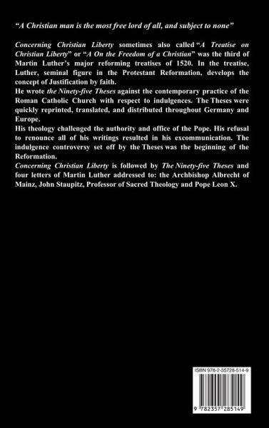 "A Christian man is the most free lord of all, and subject to none" Concerning Christian Liberty sometimes also called "A Treatise on Christian Liberty" or "A On the Freedom of a Christian" was the third of Martin Luther's major reforming treatises of 1520. In the treatise, Luther, seminal figure in the Protestant Reformation, develops the concept of Justification by faith. He wrote the Ninety-five Theses against the contemporary practice of the Roman Catholic Church with respect to indulgences. The Theses were quickly reprinted, translated, and distributed throughout Germany and Europe. His theology challenged the authority and office of the Pope. His refusal to renounce all of his writings resulted in his excommunication. The indulgence controversy set off by the Theses was the beginning of the Reformation.Concerning Christian Liberty is followed by The Ninety-five Theses and four letters of Martin Luther addressed to: the Archbishop Albrecht of Mainz, John Staupitz, Professor of Sacred Theology and Pope Leon X."Hence a right faith in Christ is an incomparable treasure, carrying with it universal salvation and preserving from all evil, as it is said,"He that believeth and is baptized shall be saved; but he that believeth not shall be damned"(Mark XVI. 16). Isaiah, looking to this treasure, predicted, "The consumption decreed shall overflow with righteousness. For the Lord God of hosts shall make a consumption, even determined (verbum abbreviatum et consummans), in the midst of the land" (Isa. X. 22, 23). As if he said, "Faith, which is the brief and complete fulfilling of the law, will fill those who believe with such righteousness that they will need nothing else for justification." Thus, too, Paul says, "For with the heart man believeth unto righteousness" (Rom. X. 10).""45. Christians are to be taught that he who sees a man in need, and passes him by, and gives [his money] for pardons, purchases not the indulgences of the pope, but the indignation of God."