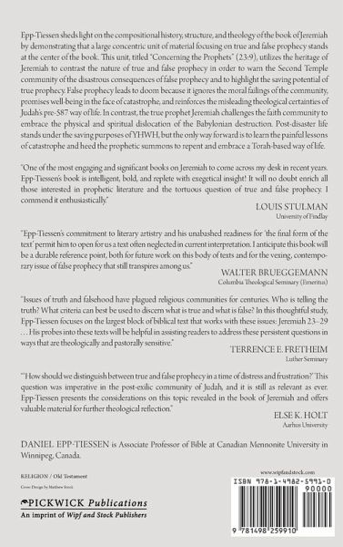 Epp-Tiessen sheds light on the compositional history, structure, and theology of the book of Jeremiah by demonstrating that a large concentric unit of material focusing on true and false prophecy stands at the center of the book. This unit, titled "Concerning the Prophets" (23:9), utilizes the heritage of Jeremiah to contrast the nature of true and false prophecy in order to warn the Second Temple community of the disastrous consequences of false prophecy and to highlight the saving potential of true prophecy. False prophecy leads to doom because it ignores the moral failings of the community, promises well-being in the face of catastrophe, and reinforces the misleading theological certainties of Judah's pre-587 way of life. In contrast, the true prophet Jeremiah challenges the faith community to embrace the physical and spiritual dislocation of the Babylonian destruction. Post-disaster life stands under the saving purposes of YHWH, but the only way forward is to learn the painful lessons of catastrophe and heed the prophetic summons to repent and embrace a Torah-based way of life.