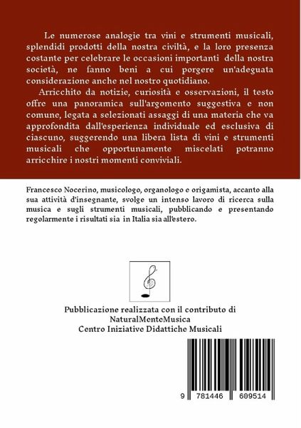 Le numerose analogie tra vini e strumenti musicali, splendidi prodotti della nostra civiltà, e la loro presenza costante per celebrare le occasioni importanti della nostra vita e della nostra storia, ne fanno beni ai quali occorre dare la giusta considerazione, anche nel nostro quotidiano. Arricchito da notizie, curiosità e considerazioni riguardanti anche la letteratura e l'arte, il testo offre una panoramica sull'argomento suggestiva e non comune, legata a selezionati assaggi di una materia che va approfondita dall'esperienza individuale ed esclusiva di ciascuno, suggerendo una libera lista di vini e strumenti musicali che, opportunamente miscelati, potranno arricchire i nostri momenti conviviali.