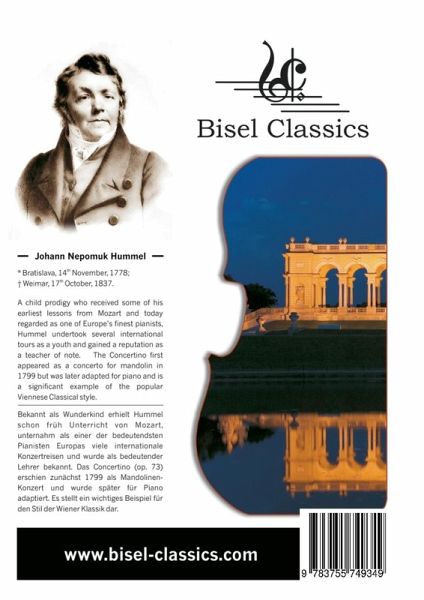 A child prodigy who received some of his earliest lessons from Mozart and today regarded as one of Europe's finest pianists, Hummel undertook several international tours as a youth and gained a reputation as a teacher of note. The Concertino first appeared as a concerto for mandolin 1799 but was later adapted for piano and isa significant example of the popular Viennese Classical style.----Bekannt als Wunderkind erhielt Hummel schon früh Unterricht von Mozart unternahm als einer der bedeutendsten Pianisten Europas viele internationale Konzertreisen und wurde als bedeutender Lehrer bekannt. Das Concertino ( op. 73 ) erschien zunächst 1799 als Mandoline - Konzert und wurde später für Piano adaptiert . Es stellt ein wichtiges Beispiel für den Stil der Wiener Klassik dar.