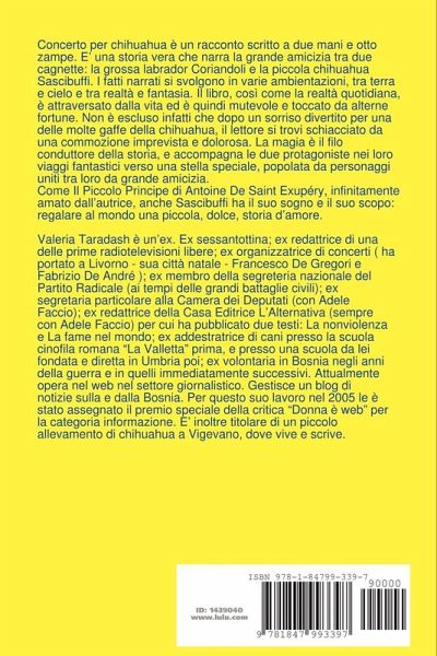 Concerto per chihuahua è un racconto scritto a due mani e otto zampe. E' una storia vera che narra la grande amicizia tra due cagnette: la grossa labrador Coriandoli e la piccola chihuahua Sascibuffi. I fatti narrati si svolgono in varie ambientazioni, tra terra e cielo e tra realtà e fantasia. Il libro, così come la realtà quotidiana, è attraversato dalla vita ed è quindi mutevole e toccato da alterne fortune. Non è escluso infatti che dopo un sorriso divertito per una delle molte buffe gaffe della chihuahua, il lettore si trovi schiacciato da una commozione imprevista e dolorosa. La magia è il filo conduttore della storia, e accompagna le due protagoniste nei loro viaggi fantastici verso una stella speciale, popolata da personaggi uniti tra loro dall'amicizia. Come Il Piccolo Principe di Antoine De Saint Exupéry, infinitamente amato dall'autrice, anche Sascibuffi ha il suo sogno e il suo scopo: regalare al mondo una piccola, dolce, storia d'amore.
