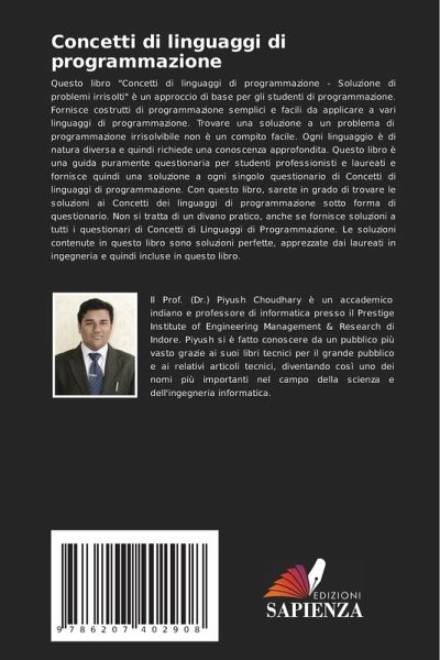 Questo libro "Concetti di linguaggi di programmazione - Soluzione di problemi irrisolti" è un approccio di base per gli studenti di programmazione. Fornisce costrutti di programmazione semplici e facili da applicare a vari linguaggi di programmazione. Trovare una soluzione a un problema di programmazione irrisolvibile non è un compito facile. Ogni linguaggio è di natura diversa e quindi richiede una conoscenza approfondita. Questo libro è una guida puramente questionaria per studenti professionisti e laureati e fornisce quindi una soluzione a ogni singolo questionario di Concetti di linguaggi di programmazione. Con questo libro, sarete in grado di trovare le soluzioni ai Concetti dei linguaggi di programmazione sotto forma di questionario. Non si tratta di un divano pratico, anche se fornisce soluzioni a tutti i questionari di Concetti di Linguaggi di Programmazione. Le soluzioni contenute in questo libro sono soluzioni perfette, apprezzate dai laureati in ingegneria e quindi incluse in questo libro.