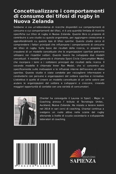Sebbene vi sia un'abbondanza di ricerche disponibili sui comportamenti di consumo e sui comportamenti dei tifosi, vi è una quantità limitata di ricerche specifiche sui tifosi di rugby in Nuova Zelanda. Questo libro si propone di contribuire a uno studio su questo argomento, per aggiungere conoscenze e approfondimenti su questo tipo di tifosi sportivi. Questo studio cerca di comprendere i fattori principali che influenzano i comportamenti di consumo dei tifosi di rugby. Sulla base dei risultati della ricerca, si propone la creazione di un modello concettuale che le organizzazioni sportive potranno utilizzare nei rispettivi settori. Questo lavoro ha sviluppato due modelli concettuali. Il modello generale è chiamato Sport Circle Consumption Model, che incorpora i temi e i sottotemi principali dei risultati della ricerca. Il secondo modello è chiamato Inner Fan Model, che si concentra più specificamente sulle motivazioni e le influenze interne dell'essere un tifoso sportivo. Questo studio è stato condotto per raccogliere informazioni e condividerle con persone e organizzazioni del settore sportivo e ricreativo. L'obiettivo è quello di creare un modello concettuale di un certo valore per aiutare le organizzazioni del settore a svilupparsi e crescere, creando maggiori opportunità di contatto con una varietà di consumatori.