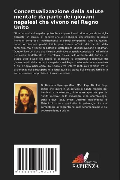 ¿Una comunità di nepalesi potrebbe svolgere il ruolo di una grande famiglia allargata, in termini di condivisione e risoluzione dei problemi di salute mentale, compreso l'indirizzamento ai servizi competenti. Tuttavia, questo pone un dilemma perché l'aiuto può essere offerto dai membri della comunità, ma a spese di potenziali pettegolezzi, disapprovazione e stigmä. Questo libro contiene una ricerca qualitativa originale completata nell'ambito del corso di dottorato in psicologia clinica dell'Università del Surrey. Lo scopo dello studio era quello di esplorare le prospettive soggettive dei giovani adulti della comunità nepalese nel Regno Unito sulla salute mentale e sul disagio psicologico. Lo studio crea interessanti collegamenti tra le esperienze dei partecipanti e la letteratura esistente sul biculturalismo e la somatizzazione dei problemi di salute mentale.