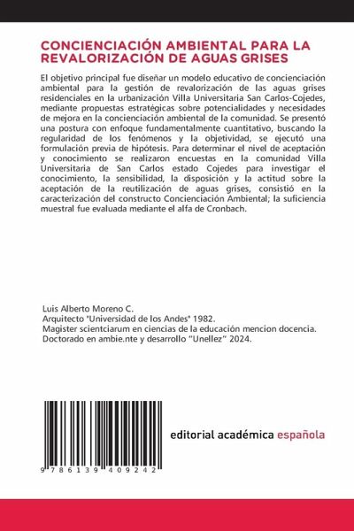 El objetivo principal fue diseñar un modelo educativo de concienciación ambiental para la gestión de revalorización de las aguas grises residenciales en la urbanización Villa Universitaria San Carlos-Cojedes, mediante propuestas estratégicas sobre potencialidades y necesidades de mejora en la concienciación ambiental de la comunidad. Se presentó una postura con enfoque fundamentalmente cuantitativo, buscando la regularidad de los fenómenos y la objetividad, se ejecutó una formulación previa de hipótesis. Para determinar el nivel de aceptación y conocimiento se realizaron encuestas en la comunidad Villa Universitaria de San Carlos estado Cojedes para investigar el conocimiento, la sensibilidad, la disposición y la actitud sobre la aceptación de la reutilización de aguas grises, consistió en la caracterización del constructo Concienciación Ambiental; la suficiencia muestral fue evaluada mediante el alfa de Cronbach.