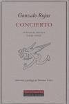 Concierto es una espléndida antología de uno de los grandes poetas hispanoamericanos del siglo XX. El título contiene una amplia muestra de la poesía de Gonzalo Rojas y de sus Ejercicios en prosa. Se trata de una excelente selección realizada y prologada por Nicanor Vélez, que recoge la labor de casi siete décadas de producción literaria del chileno.