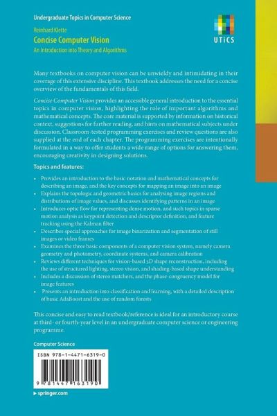 This textbook provides an accessible general introduction to the essential topics in computer vision. Classroom-tested programming exercises and review questions are also supplied at the end of each chapter. Features: provides an introduction to the basic notation and mathematical concepts for describing an image and the key concepts for mapping an image into an image; explains the topologic and geometric basics for analysing image regions and distributions of image values and discusses identifying patterns in an image; introduces optic flow for representing dense motion and various topics in sparse motion analysis; describes special approaches for image binarization and segmentation of still images or video frames; examines the basic components of a computer vision system; reviews different techniques for vision-based 3D shape reconstruction; includes a discussion of stereo matchers and the phase-congruency model for image features; presents an introduction into classification and learning.