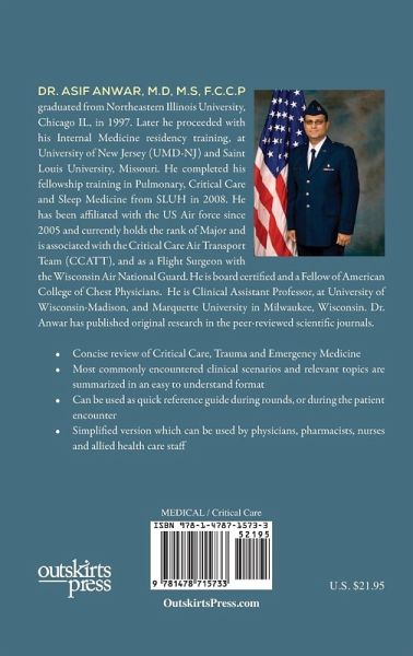 Dr. Asif Anwar, M.D, M.S, F.C.C.P graduated from Northeastern Illinois University, Chicago IL, in 1997. Later he proceeded with his Internal Medicine residency training, at University of New Jersey (UMD-NJ) and Saint Louis University, Missouri. He completed his fellowship training in Pulmonary, Critical Care and Sleep Medicine from SLUH in 2008. He has been affiliated with the US Air force since 2005 and currently holds the rank of Major and is associated with the Critical Care Air Transport Team (CCATT), and as a Flight Surgeon with the Wisconsin Air National Guard. He is board certified and a Fellow of American College of Chest Physicians. He is Clinical Assistant Professor, at University of Wisconsin-Madison, and Marquette University in Milwaukee, Wisconsin. Dr. Anwar has published original research in the peer-reviewed scientific journals. - Concise review of Critical Care, Trauma and Emergency Medicine - Most commonly encountered clinical scenarios and relevant topics are summarized in an easy to understand format - Can be used as quick reference guide during rounds, or during the patient encounter - Simplified version which can be used by physicians, pharmacists, nurses and allied health care staff