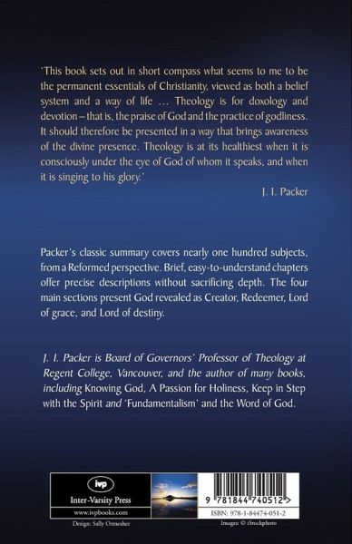 This book sets out in short compass what seems to me to be the permanent essentials of Christianity, viewed as both a belief system and a way of life ... Theology is for doxology and devotion - that is, the praise of God and the practice of godliness. It should therefore be presented in a way that brings awareness of the divine presence. Theology is at its healthiest when it is consciously under the eye of God of whom it speaks, and when it is singing to his glory.' - J. I PackerPacker's classic summary covers nearly one hundred subjects, from a Reformed perspective. Brief, easy-to-understand chapters offer precise descriptions without sacrificing depth. The four main sections present God revealed as Creator, Redeemer, Lord of grace, and Lord of destiny.