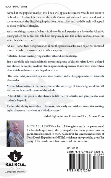 Aimed at the popular market, this book will appeal to readers who do not want to be burdened by detail. It presents the author's conclusions based on facts and invites them to ponder the disturbing implications. Its succinct and readable style will appeal to those with busy lifestyles. An astonishing account of what it is like to die and experience a day in the Afterlife, during which the author was told how things really are! The author ventures into areas where few dare to tread. At last - sober facts not speculation about the paranormal from an objective, unbiased researcher who tries to take a scientific viewpoint. "Michael Lewis' writing rings with truth and authenticity. It is a carefully selected and finely expressed group of closely related, well defined and chosen concepts, no doubt from a personal experience that is even wider than that which we here are privileged to share. The material is presented in a narrative context, and will engage and often astonish the reader. Michael demonstrates that we are but at the very edge of knowledge, and that all we can see is a small corner of the whole. A book like this gives us the chance to lift the veil a little, and glimpse the vast uplands beyond. He has the ability to set down the material clearly and with an attractive writing style, the prose is as clear as a window-pane." - Mark Sykes, former Editor-in-Chief, Athena Press
