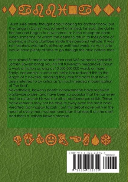 From the great mind of Jorben Bowen comes Jorben Bowen's debut novel "CONCORD SWORDFIREWOLF AND THE MONSTER THAT". Join a underdeveloped prince on his journey for answers, power and plot development. Watch as he crossed paths with a blade-wielding dwarf who threatens to perform a drunken circumcision on our hero. Reel in the shadow of the Stabbinator, beast-of-all-beasts. Join us on a leisurely trek into the mind of the Scandinavian genius, and become lost in his vivid mindscapes. "Good." - The Times