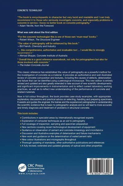Introduction. Petrographic equipment and methods. Sampling and specimen preparation. Composition of concrete. Appearance and textures of cementitious materials. Examination of deteriorated and damaged concrete. Precast and special concretes. Portland cement mortar, screeds, renders and special cements. Non-Portland cementitious materials, plasters and mortars. Glossary of minerals.