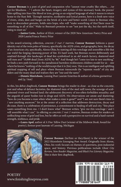 concrete, rust, marrow is a new chronicle of queer experience from the heart of the Rust Belt. Enveloping themselves in landscapes of murky water and empty factories, these poems wrestle with place, history, queerness, and the natural world, facing down the ghosts of a collective past while imagining a better, kinder future.