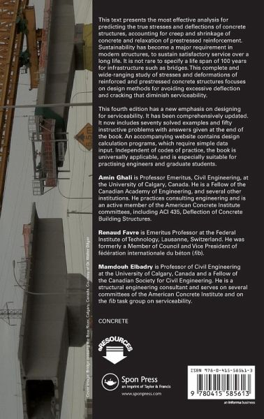 Amin Ghali is Professor Emeritus, Civil Engineering, at the University of Calgary, Canada. He is a Fellow of the Canadian Academy of Engineering, and several other institutions. He practices consulting engineering and is an active member of the American Concrete Institute committees, including ACI 435, Deflection of Concrete Building Structures. Renaud Favre is Emeritus Professor at the Federal Institute of Technology, Lausanne, Switzerland. He was formerly a Member of Council and Vice President of fédération internationale du béton (fib). Mamdouh Elbadry is Professor of Civil Engineering at the University of Calgary, Canada and a Fellow of the Canadian Society for Civil Engineering. He is a structural engineering consultant and serves on several committees of the American Concrete Institute and on the fib task group on serviceability.