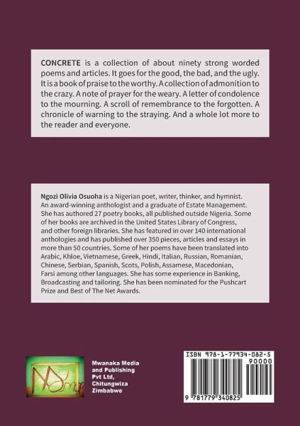 CONCRETE is a collection of about ninety strong worded poems and articles. It goes for the good, the bad, and the ugly. It is a book of praise to the worthy. A collection of admonition to the crazy. A note of prayer for the weary. A letter of condolence to the mourning. A scroll of remembrance to the forgotten. A chronicle of warning to the straying. And a whole lot more to the reader and everyone.