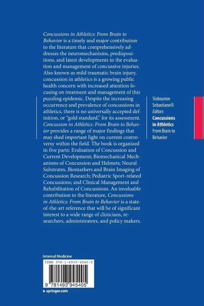 Concussions in Athletics: From Brain to Behavior is a timely and major contribution to the literature that comprehensively addresses the neuromechanisms, predispositions, and latest developments in the evaluation and management of concussive injuries. Also known as mild traumatic brain injury, concussion in athletics is a growing public health concern with increased attention focusing on treatment and management of this puzzling epidemic. Despite the increasing occurrence and prevalence of concussions in athletics, there is no universally accepted definition, or "gold standard," for its assessment. Concussion in Athletics: From Brain to Behavior provides a range of major findings that may shed important light on current controversy within the field. The book is organized in five parts: Evaluation of Concussion and Current Development; Biomechanical Mechanisms of Concussion and Helmets; Neural Substrates, Biomarkers and Brain Imaging of Concussion Research; Pediatric Sport-related Concussions; and Clinical Management and Rehabilitation of Concussions. An invaluable contribution to the literature, Concussions in Athletics: From Brain to Behavior is a state-of-the-art reference that will be of significant interest to a wide range of clinicians, researchers, administrators, and policy makers.