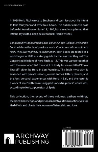 n 1988 Herb Fitch wrote to Stephen and Lynn Jay about his intent to take four years and write four books. This did not come to pass before his transition on June 13, 1996, but a seed was planted that left the Jays with a deep desire to fulfill Herb's wishes. Condensed Wisdom of Herb Fitch, Volume 2: The Golden Circle of the Soul builds on the Jays' previous work, Condensed Wisdom of Herb Fitch, The Silver Highway to Redemption. Both books are rooted in a work began in 1988 as a study guide for the Jays that they call The Condensed Wisdom of Herb Fitch, A - Z. This was woven together with the meat of a 1969 transcript of thirty lessons entitled "Know Thyself," given by Herb in San Francisco. This high mysticism is seasoned with private lessons, journal entries, letters, photos, and the Jays' personal experiences with Herb in Bali, and the result is a work of love "with no missing parts or extra pieces," which was, according to Herb, a pure sign of Spirit. This collection, the second of three volumes, gathers writings, recorded knowledge, and personal narratives from mystic revelator Herb Fitch and charts their journey of friendship and love.