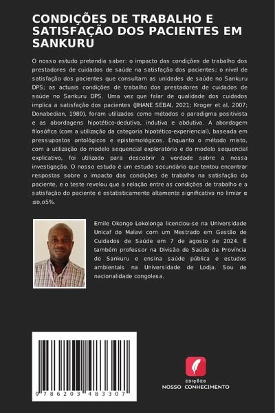 O nosso estudo pretendia saber: o impacto das condições de trabalho dos prestadores de cuidados de saúde na satisfação dos pacientes; o nível de satisfação dos pacientes que consultam as unidades de saúde no Sankuru DPS; as actuais condições de trabalho dos prestadores de cuidados de saúde no Sankuru DPS. Uma vez que falar de qualidade dos cuidados implica a satisfação dos pacientes (JIHANE SEBAI, 2021; Kroger et al, 2007; Donabedian, 1980), foram utilizados como métodos o paradigma positivista e as abordagens hipotético-dedutiva, indutiva e abdutiva. A abordagem filosófica (com a utilização da categoria hipotético-experiencial), baseada em pressupostos ontológicos e epistemológicos. Enquanto o método misto, com a utilização do modelo sequencial exploratório e do modelo sequencial explicativo, foi utilizado para descobrir a verdade sobre a nossa investigação. O nosso estudo é um estudo secundário que tentou encontrar respostas sobre o impacto das condições de trabalho na satisfação do paciente, e o teste revelou que a relação entre as condições de trabalho e a satisfação do paciente é estatisticamente altamente significativa no limiar ¿ ¿o,o5%.