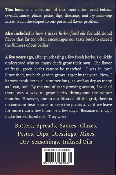 This 72-page 6x9" softcover book is a collection of our most often used kinds of butter, spreads, sauces, glazes, pestos, dips, dressings, mixes, and dry seasoning mixes. As an added bonus the last few pages tell how to make infused cooking oils.