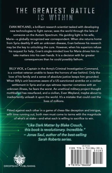 THE GREATEST BATTLE IS WITHIN. Fantastic Voyage meets The Fugitive in this explosive medical techno-thriller from the multi-award-winning authors of It Takes Death to Reach a Star. "This solid sci-fi thriller [is] a well-balanced thrill ride. Well-shaded characters keep the pages turning. Fans of high-tech medical and military thrillers should check this out." ~ Publishers Weekly. EVAN WEYLAND, a brilliant research scientist tasked with developing new technologies to fight cancer, sees the world through the lens of someone on the Autism Spectrum. His guiding light is his wife, Marie-a globally recognized war correspondent. When she returns home from Syria deathly ill with an unknown disease, Evan believes his research may be the key to unlocking the cure. However, when his superiors refuse his request for help, Evan's single-minded love for Marie drives him to take matters into his own hands. It is a decision with far greater consequences than he could possibly fathom. BILLY VICK, a Captain in the Army's Criminal Investigation Command, is a combat veteran unable to leave the horrors of war behind. Only the love of his family and a sense of absolute justice keeps him grounded. When Billy's unit becomes aware of a US-sanctioned airstrike on a civilian settlement in Syria and an eye-witness reporter comatose with an unknown illness, he fears the worst. An unethical military project thought mothballed has resurfaced, and a civilian, Evan Weyland, maybe about to inadvertently unleash it upon the world. It's a mistake that could cost the lives of millions. Pitted against each other in a game of chess-like deception and intrigue, with time running out, both men must come to terms with the magnitude of what's at stake-and what each is willing to sacrifice to win.