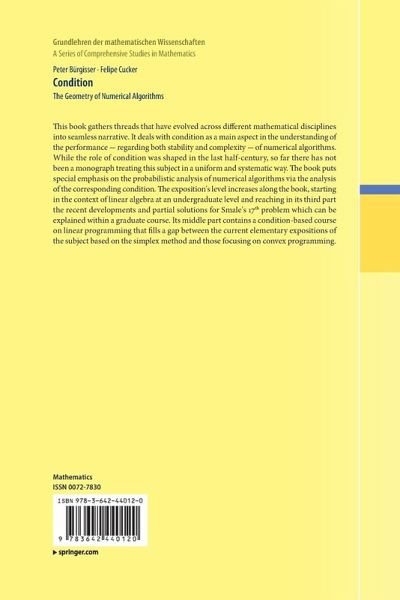 "This book published in 2013 is the first book devoted entirely on this subject. It must be said that this book is a full success since it realizes a synthesis of ideas and works on the mathematical foundations on conditioning. ... The book is self contained and easy to read ... . The book ends with the statement of eighteen open problems that shows that Mr. Condition has a bright future ahead of him." (Jean-Claude Yakoubsohn, Jahresbericht der Deutschen Mathematiker-Vereinigung, Vol. 117, 2015)